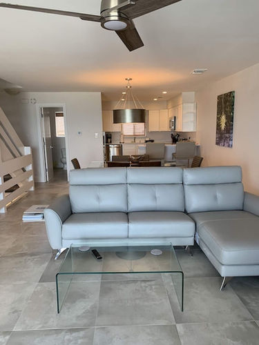 The spacious first level of this home has tile flooring and contemporary furnishings in an open concept living, dining, kitchen area, along with a half bath. The living room has barrel swivel chairs with an ottoman, a sectional sofa, and a 60" smart TV. The open deck off the living room has plenty of seating where you'll enjoy the panoramic gulf views and stunning sunsets unique to this part of the Cape. There is also a gas grill for your convenience.